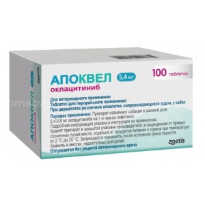 Апоквел 5,4 мг (100 таб) при дерматитах различной этиологии, сопровождающихся зудом, у собак.